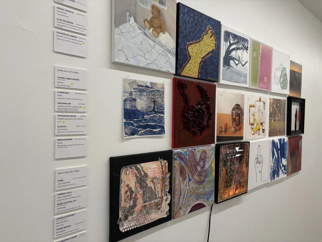 Each artist was invited to create a 12”x12” artwork, and together the pieces form a vibrant quilt-like installation.