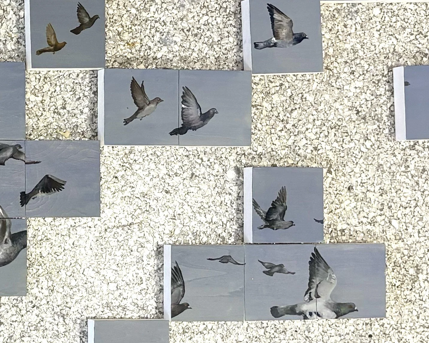 Composed of forty-eight 3-inch square oil paintings of pigeons in flight, the exhibit unfolds sequentially, forming a dispersed flock that appears to move just ahead of the viewer. Together, the works accumulate into a larger field of motion, a living system that is never fully fixed, only experienced in passing.